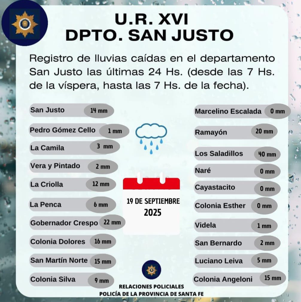 SOCIEDAD DATOS DE LLUVIAS DEPARTAMENTO SAN JUSTO 19 DE SEPTIEMBRE. Luciano septiembre 19, 2025 Acerca del autor Luciano Editor Ver todas las entradas Navegación de entradas Anterior: Moverse distinto, vivir mejor.Siguiente: Confirmación judicial: Nación deberá reparar la Ruta 11 desde Santa Fe a San Justo. Historias relacionadas SOCIEDAD Sorteo Créditos NIDO. Favorecidos San Justo. Luciano enero 9, 2026 SOCIEDAD Sorteo Créditos NIDO. Favorecidos San Javier. Luciano enero 9, 2026 SOCIEDAD Parroquia Nuestra Señora del Rosario de Videla, Campamento. Luciano enero 6, 2026