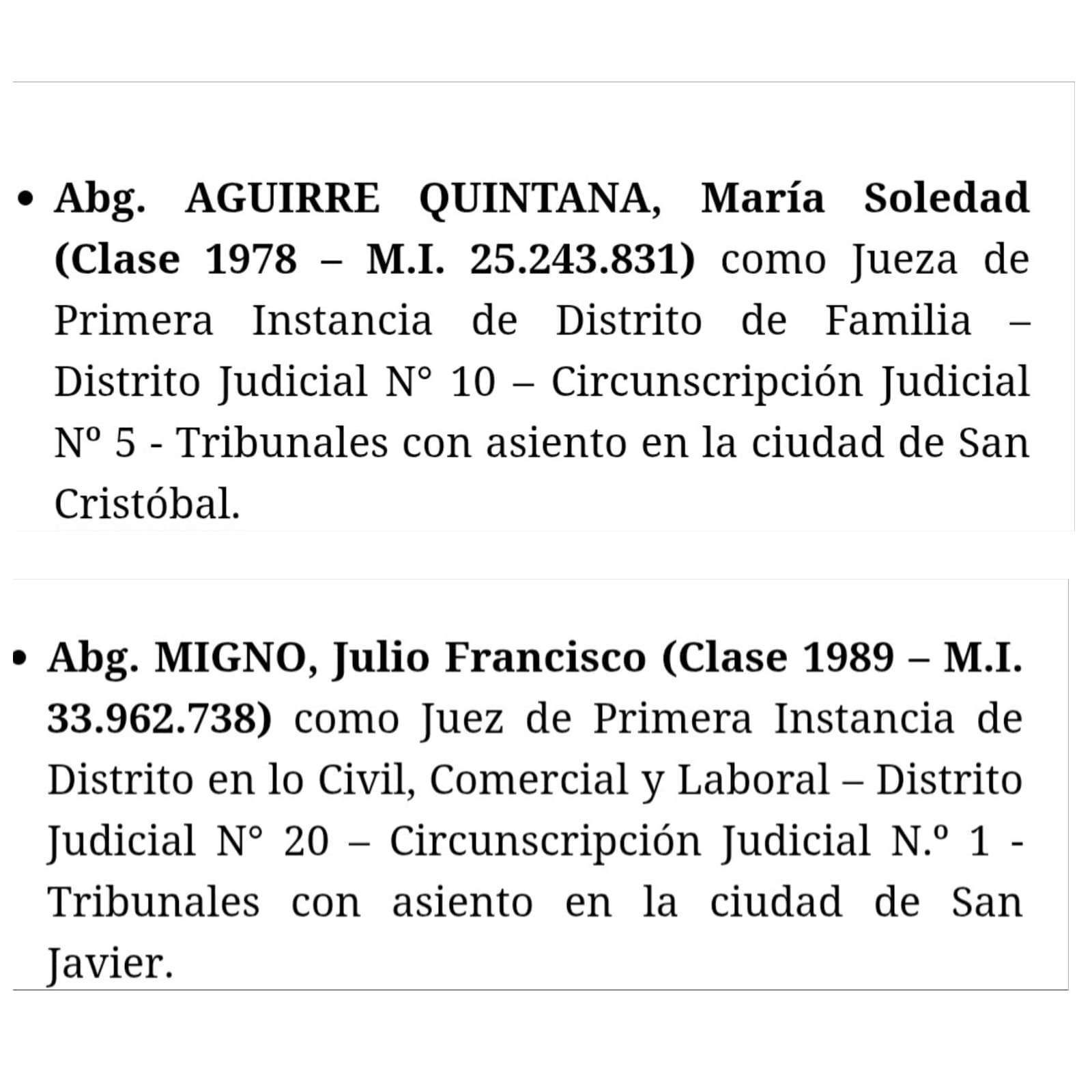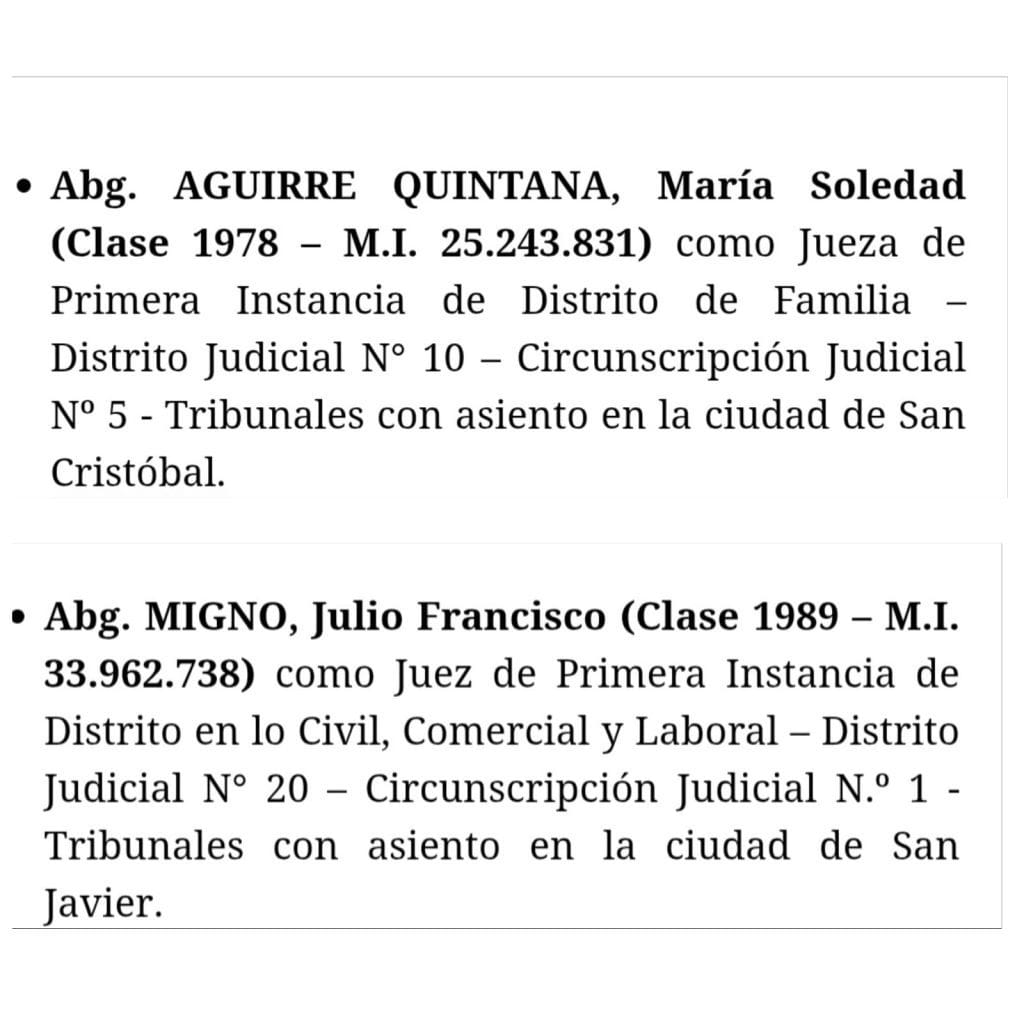 En la región se destacan la Sanjustina Soledad Aguirre Quintana propuesta como Jueza de primera instancia de distrito de familia en San Cristóbal y el Sanjavierino Julio Migno propuesto como Juez de primera instancia de distrito civil , comercial y laboral de San Javier.