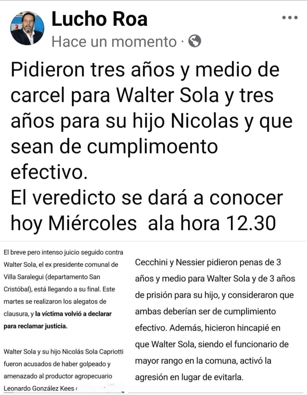 POLICIALES PIDIERON TRES AÑOS Y MEDIO DE CARCEL PARA WALTER SOLA Y TRES AÑOS PARA SU HIJO NICOLAS. Luciano octubre 22, 2025 Acerca del autor Luciano Editor Ver todas las entradas Navegación de entradas Anterior: ALUMNOS DE LA ESCUELA SECUNDARIA DE VIDELA PARTICIPAN EN SANTA FE DE LA JORNADA INTERNACIONAL DE JOVENES EMPRENDEDORES.Siguiente: EL POLI DE VIDELA ADELANTA LA FECHA 9. JUEGA DE LOCAL ESTE VIERNES. Historias relacionadas POLICIALES SAN JUSTO: PDI DETUVO A UN HOMBRE POR HURTO. Luciano enero 3, 2026 POLICIALES Aprehensión de un masculino en M. Escalada por hechos de violencia y daños. Luciano enero 2, 2026 POLICIALES Violento episodio en Gobernador Crespo con un herido de gravedad. Luciano enero 2, 2026